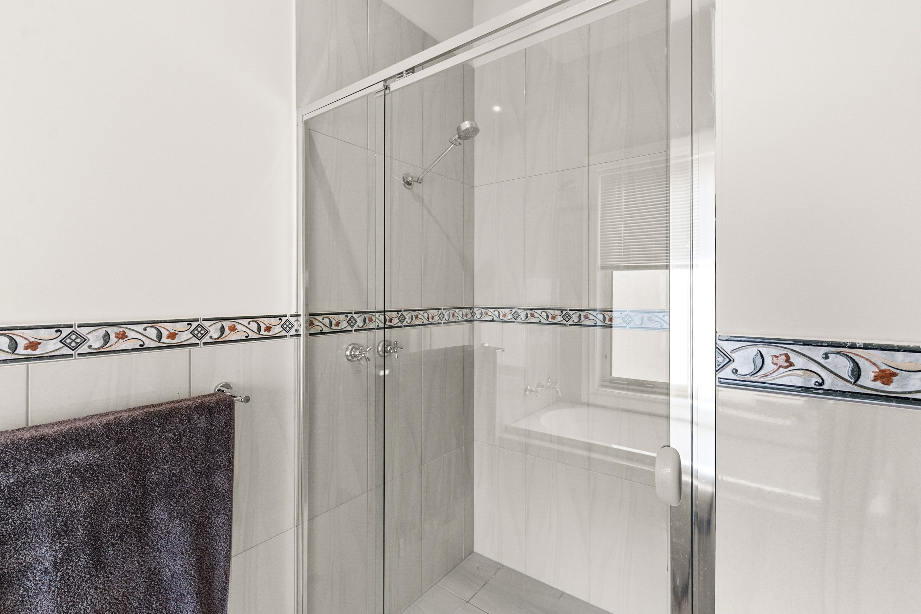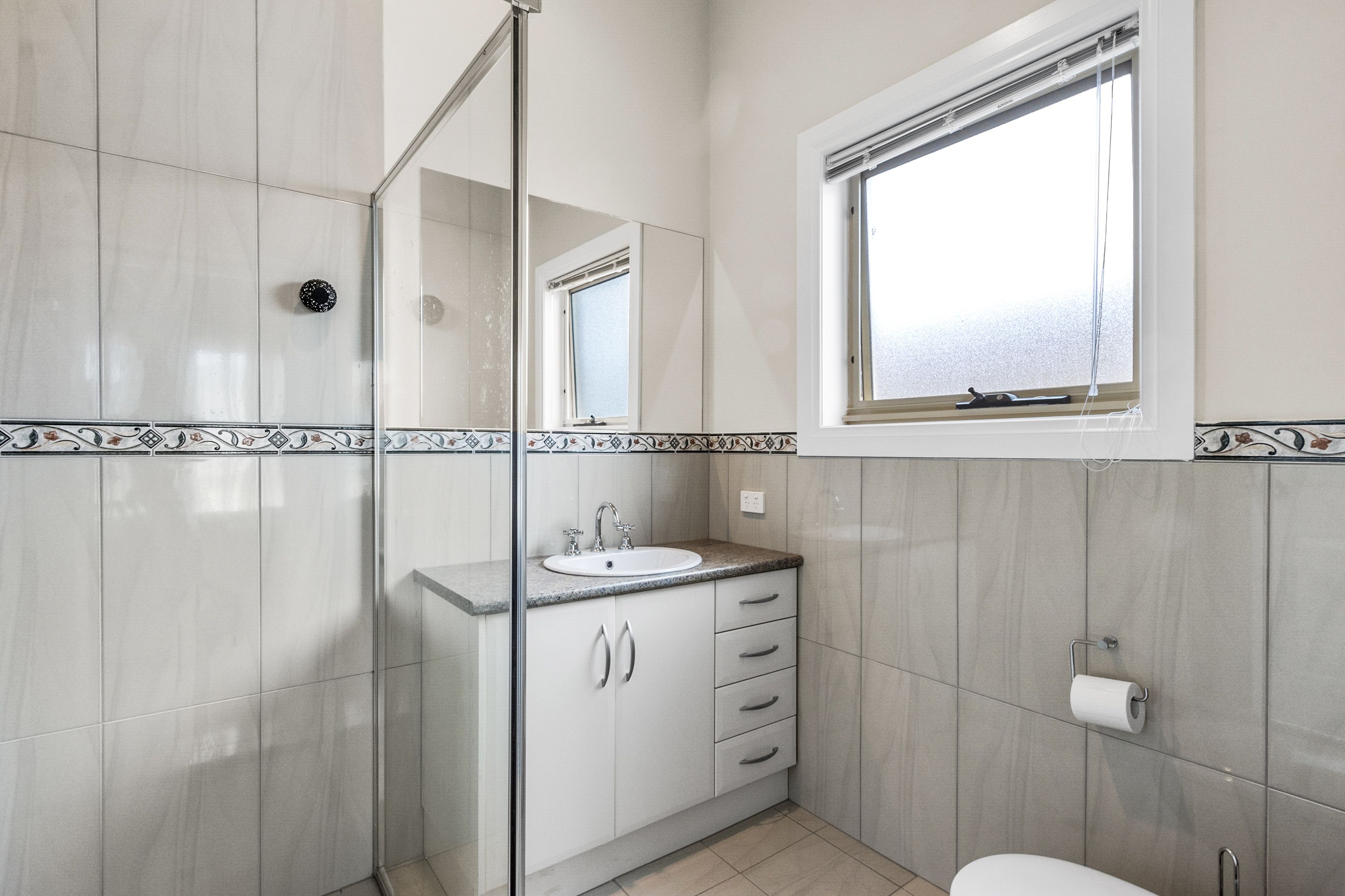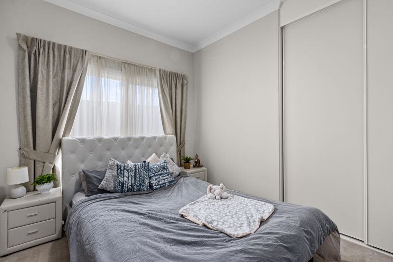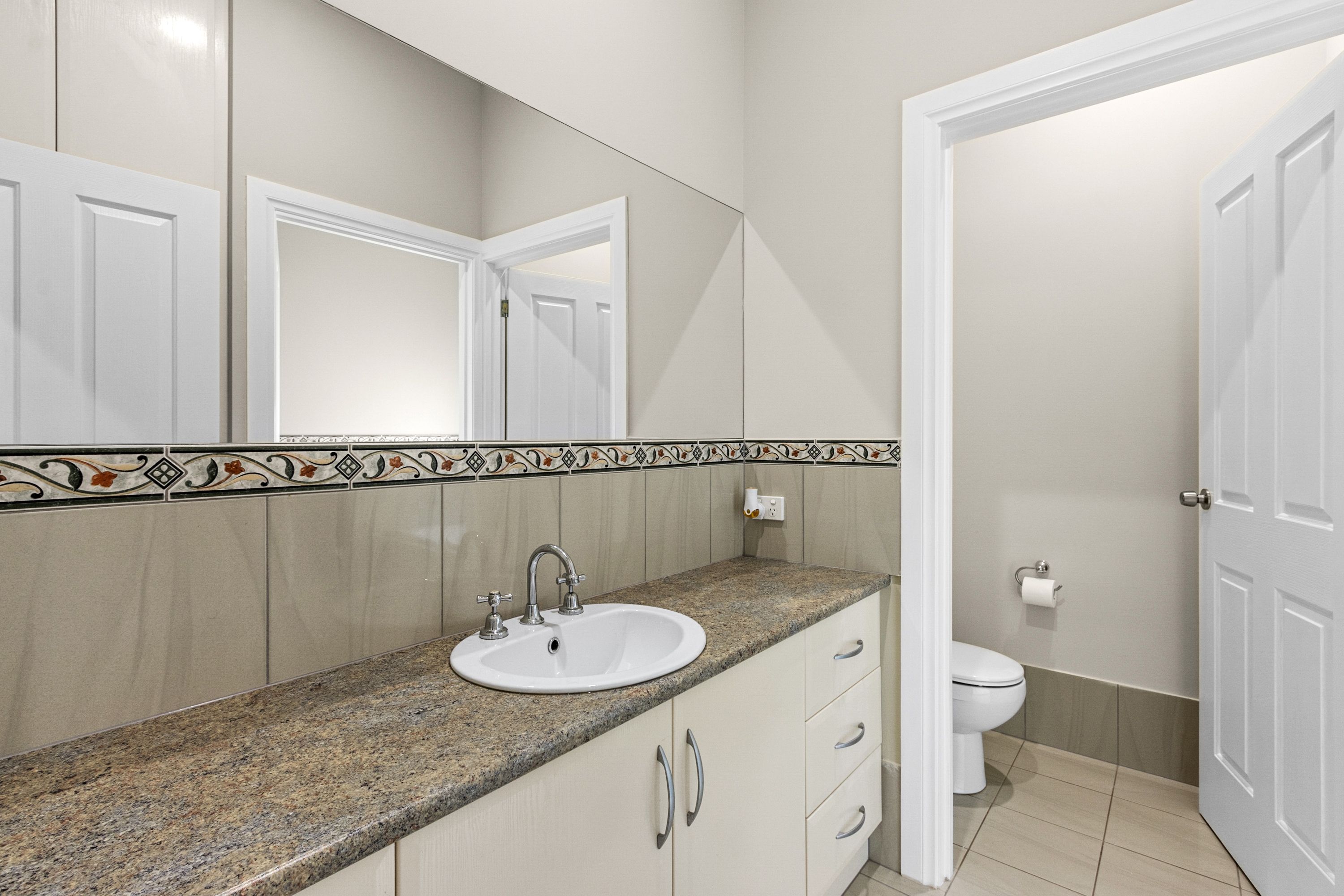 The main bedroom is air-conditioned, equipped with a ceiling fan, a walk-in robe, and an ensuite, and is spacious enough to accommodate a king-size bed. The other two bedrooms are generously sized, featuring ceiling fans and built-in robes. The main bathroom, designed in the popular 3-way style, is conveniently located next to these bedrooms.