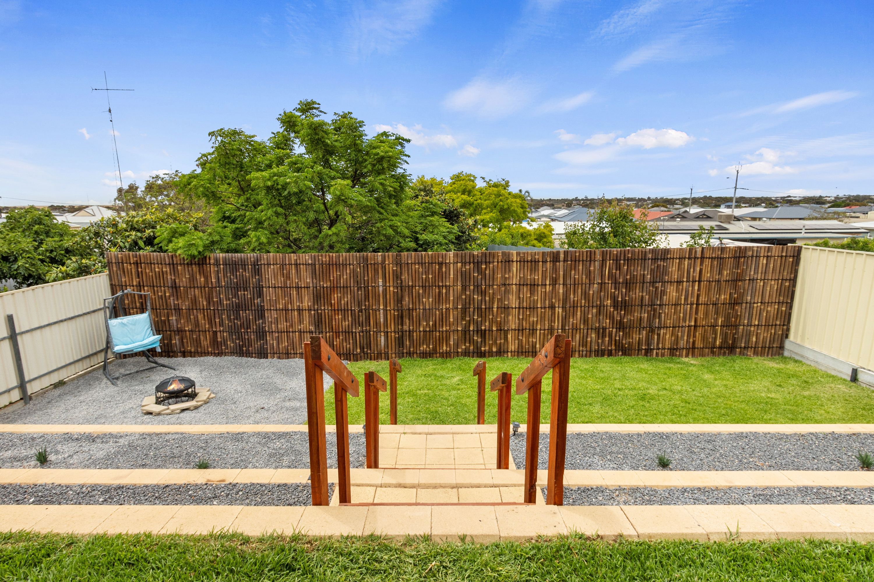 The is positioned beautifully to experience cool breezes from the front door the to the back alfresco. The rear alfresco over looks the terraced garden beds that lead down to the lower grassed area for children or for pets and there is the perfect spot for the firepit. The tall bamboo rear feature fence provides a soft wall to create privacy from neighbours behind. The elevation of the home allows for sweeping views of farm land to the north of Moonta Bay.