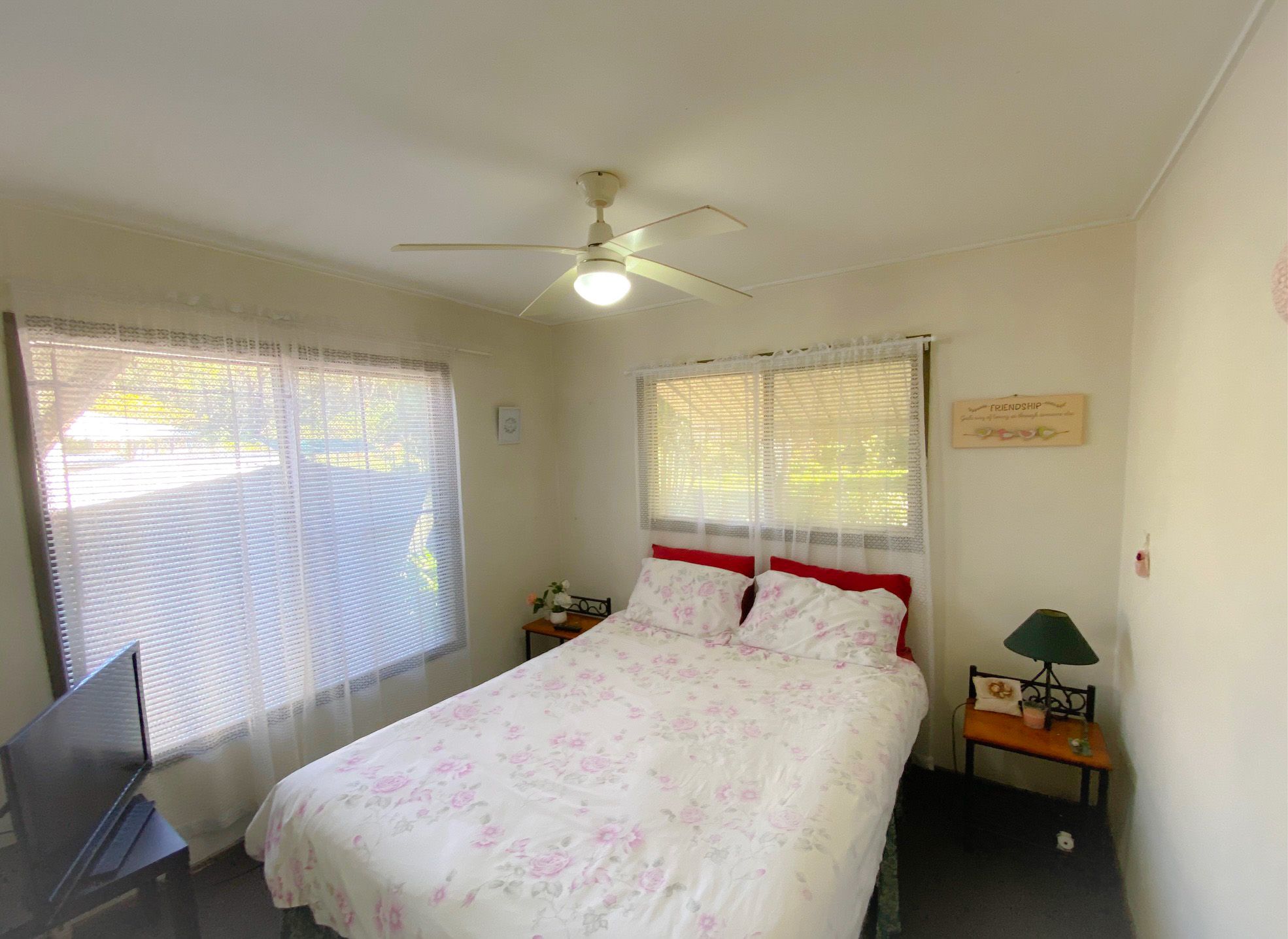 • Second bedroom with semi-mirrored robes, ceiling fan & TV point