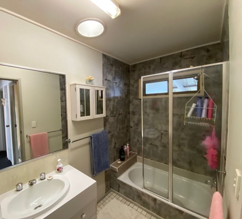 • Bathroom with shower, vanity, bath, skylight, exhaust fan & towel rails