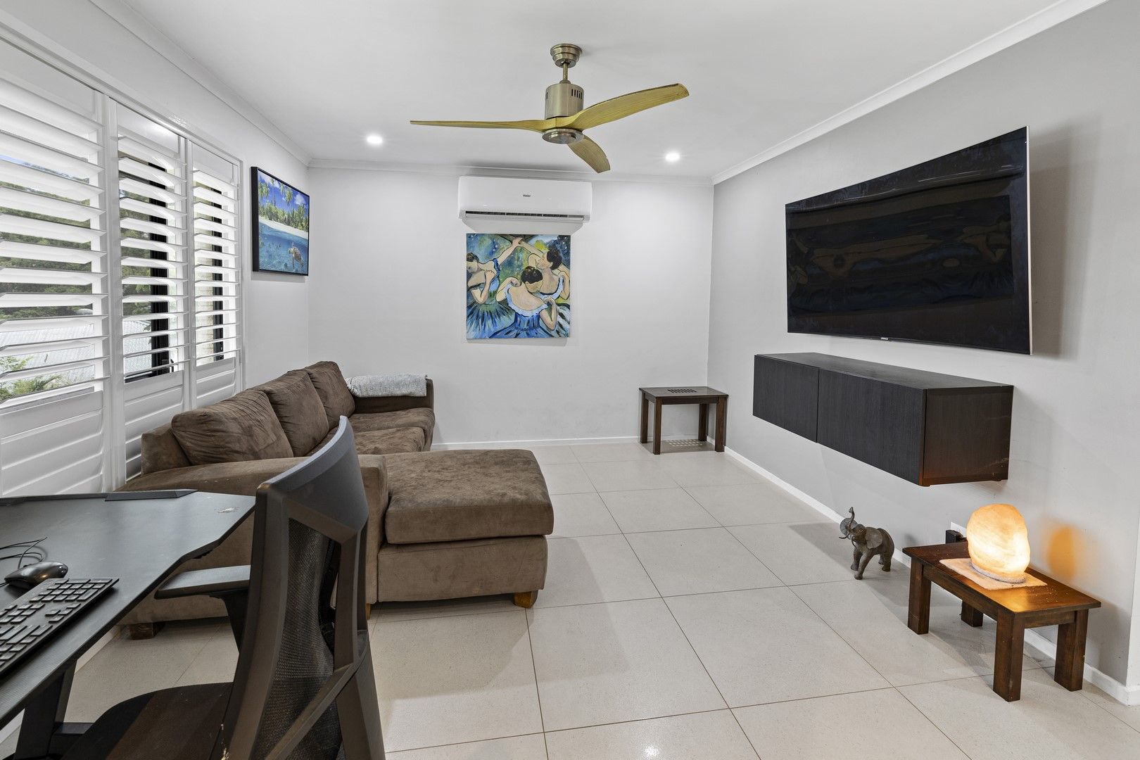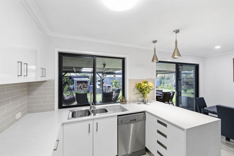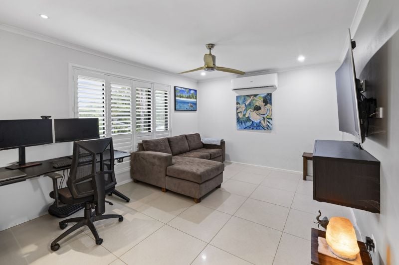 For sale by Leigh Martinuzzi from MPG, this meticulously renovated property boasts a blend of modern comforts and serene outdoor living. Situated at the end of a peaceful cul-de-sac, the brick home is enveloped by lush tropical landscaping on a generously sized block.