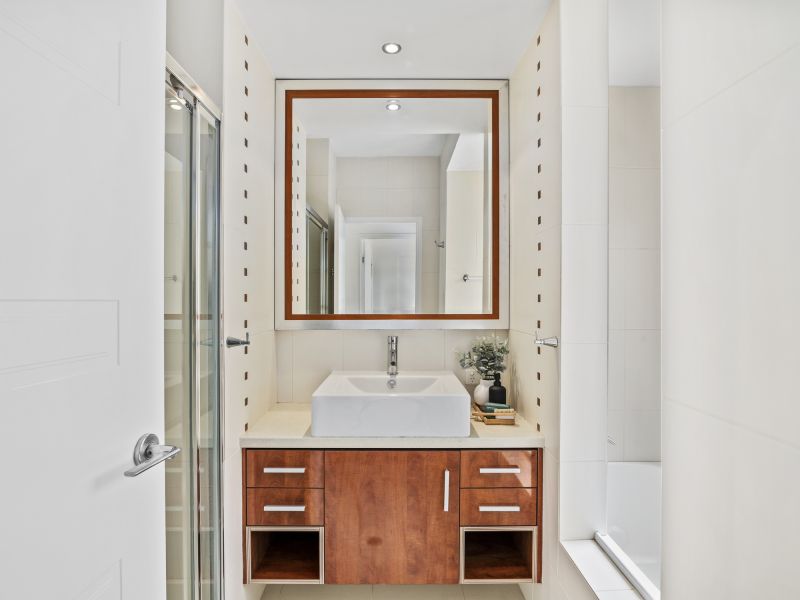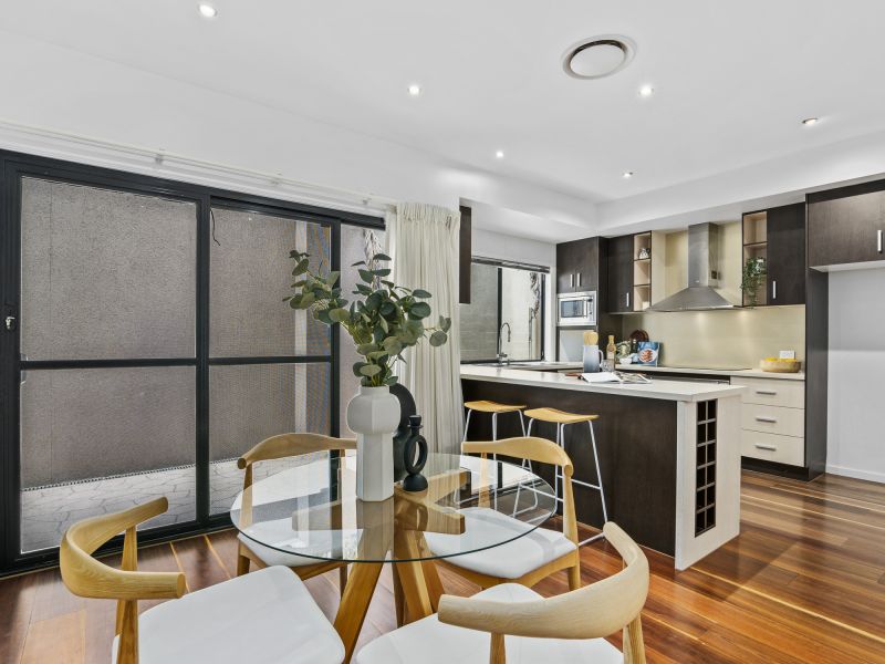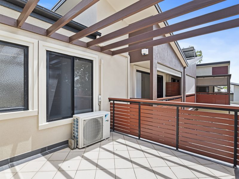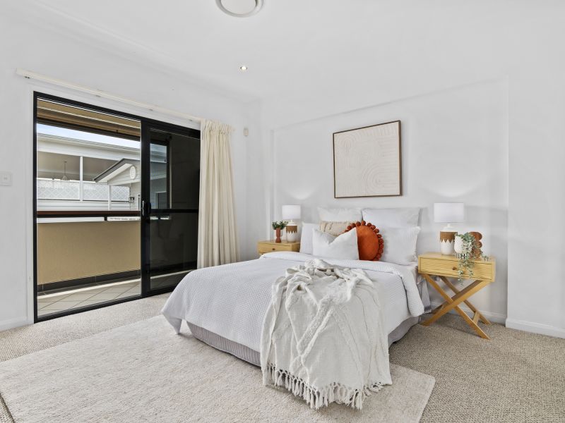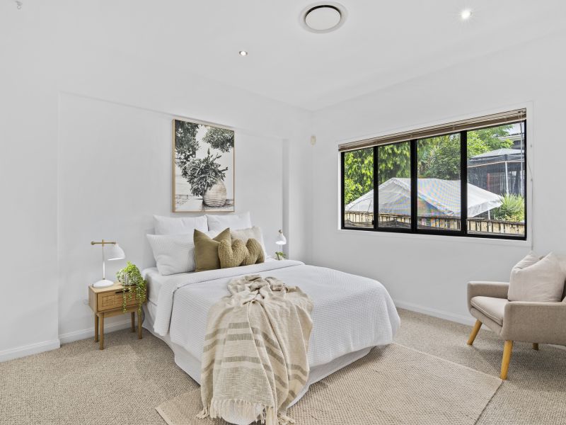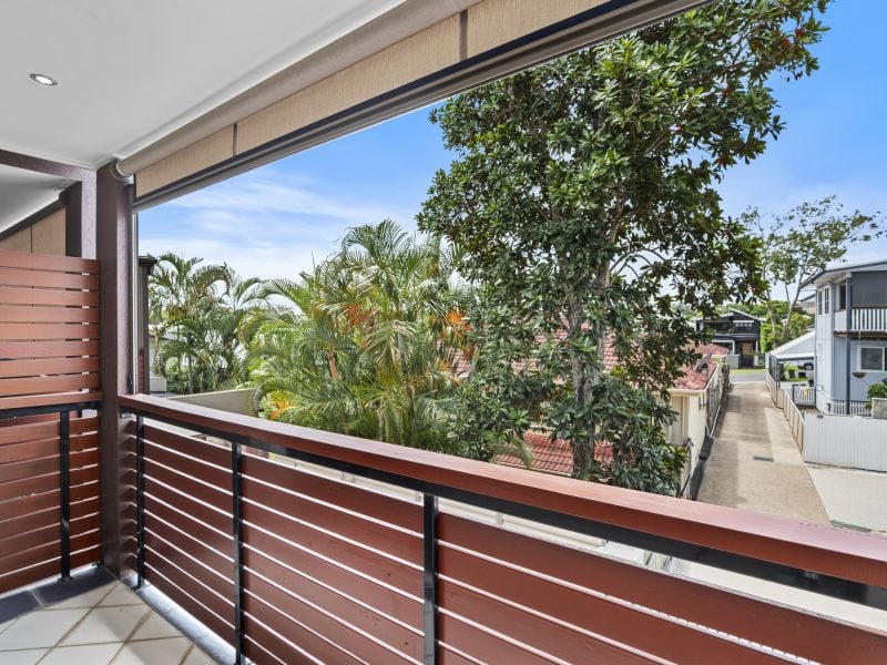Bedroom 2 is equally inviting, adorned with mirrored built-in robes and a study nook strategically positioned to capture an abundance of natural light, creating an inspiring space for work or study. This bedroom also enjoys its own private balcony, offering sweeping vistas of the picturesque Coorparoo Hills, enhancing the overall ambiance of tranquility and serenity.