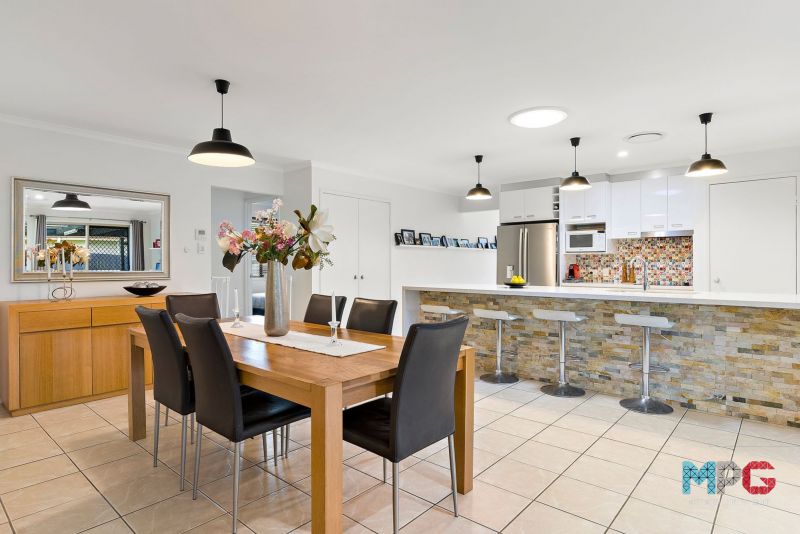The spacious dining and rumpus area seamlessly connects to the covered alfresco space, overlooking a sparkling saltwater pool – an ideal spot for family gatherings or relaxing weekends. The well-appointed kitchen allows you to keep an eye on the children playing outside while preparing meals, and after a long day, you can retreat to the pool's jet spa bench for a moment of pure indulgence.